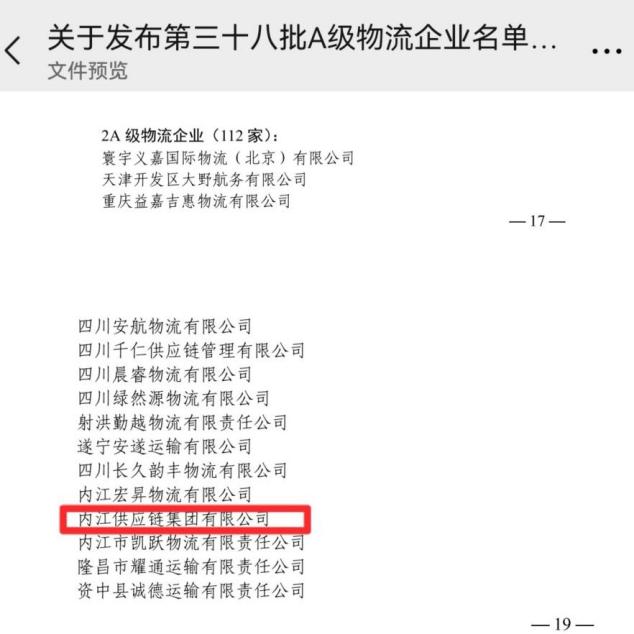 全國A級(jí)物流企業(yè)是我國物流領(lǐng)域最具權(quán)威的資質(zhì)認(rèn)定,近日,全國第三十八批次A級(jí)物流企業(yè)結(jié)果名單揭曉,內(nèi)江路橋集團(tuán)下屬企業(yè)內(nèi)江供應(yīng)鏈集團(tuán)有限公司進(jìn)入榜單之列,被中國物流與采購聯(lián)合會(huì)授予“國家2A級(jí)物流企業(yè)”稱號(hào)。